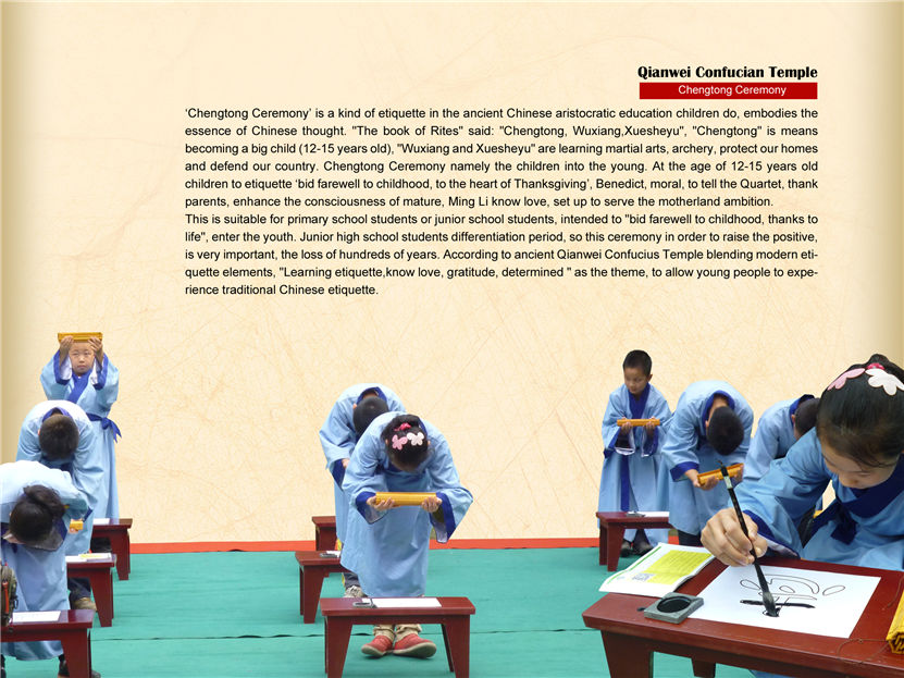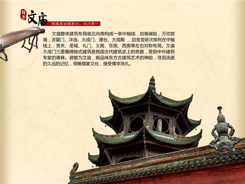 拜 台 拜台,也称燎台,它是历代祭祀孔子的重要场所,所有的祭献仪式都在这里开展。拜台一共有二十块栏板,雕刻160只蝙蝠,形态各异而绝不雷同。 每年春秋两次祭孔仪式时,随着钟鼓鸣响,祭祀队伍在主祭官引导下由礼门整肃而进,大成门徐徐开启,祭坛上摆放着猪牛羊三牲,主祭官濯水、沐手、净巾,奉读祝文和敬献祭酒,率祭祀队伍逐一完成跪拜叩首,众人虔诚俯身,祭拜大成至圣先师。整个祭祀活动过程由迎神、献酒、祝文和敬香等组成,大成殿馨香缭绕,鸣钟击罄,古乐悠扬,场面盛大,神圣而庄严。 东 庑·西 庑 位于大成门后东西两侧,是大成门与大成殿之间的主要通道,长廊深邃,气象庄严,表达出祭孔的肃穆与尊严。东、西庑内原来供奉有72先贤先儒的牌位,2005年文庙全面维修复原工程竣工后,塑造了72尊先贤先儒的精美塑像,东西两侧各36尊,成为犍为文庙的特色景观。 大成殿 前面就是祭祀孔子的正殿大成殿,它建于清代康熙四十五年。大成殿气势雄伟,规模恢弘,金碧辉煌,是国内文庙大成殿中不可多见的宫殿式建筑。殿内供奉孔子塑像, 以及四配:颜回、子思、曾子、孟子和十二哲人。 大殿内的柱础,被国家文物专家誉为“国宝”级文物。大殿内这些柱子一共有28根,代表了天上的二十八颗星宿,而处于中心区的全楠木大柱子有八根,雕刻极为精美,造型生动逼真,雕刻技法多样,全部采用整石雕刻而成。它以铁石为材,非常坚硬,历经数百年风雨沧桑,没有丝毫风化和磨损的痕迹,真可谓坚如钢铁,不朽不坏,名不虚传。堪称古代石刻艺术的精品杰作,也是文庙的镇庙之宝。 在大成殿矗立一座精致典雅的庙堂,名叫启圣宫,供奉着孔子的先父叔梁纥及历代先祖。启圣宫门楣上两副“九龙戏珠”和“双凤朝阳”两副木雕,极为精美,为当年建庙时留存至今的真品,没有丝毫损坏,让人叹为观止。 万仞宫墙 它是文庙第一道屏风,出自他的学生子贡的话:“夫子之墙数仞,不得其门而入,不见宗庙之美,百官之富。”比喻孔子道德的完美和文学的造诣,常人无法企及。立于宫墙之前,崇敬之情自会油然而生。 试士馆 试士馆,俗称考棚,是古代乡试的场所。中国古代科举学制形式虽然呆板,教条弊病很多,约束人思维发展,但它的积极性在于不分贫富贵贱,只要有学问就可参加考试博选优才。以前的考棚每个屋子是由隔墙隔开的专用考试场所。而现在的试士馆,举行各种学术活动,国学讲座、社团聚会以传承传统文化。 焕文街 “焕文街”总占地面积近5000平方米,建筑面积3800平方米,建筑风格与文庙相映成辉,宫廷式与民居式相得益彰。犍为史志记载,文庙东裙房,主要有:节孝祠、神坐台、古井台、刘家祠堂、民宅几大建筑群构成。“焕文街”主要是对其进行了恢复重建。 焕文街一个重要的景点即戏楼,这里是展示犍为地方民俗文化的舞台,各种具有地方特色的传统民间文化表演如:评书、散打、杂技、魔术、戏曲、民乐等在此系数上演。 在戏楼的对面就是节孝祠,这里历史上供奉的是传统的二十四节孝牌位,它是为了纪念汉代孝女先络的祠堂。 焕文街仿古建筑群雕梁画栋,木门木窗,古朴典雅。全长170米,分为内街和外街。外街即文林街(牌坊街)有临街门市29间,内街临街门市18间,内街有古色古香的戏楼、节孝祠、考棚、客栈、茶楼等,形成错落有致、曲径通幽的仿古民居建筑群。部分商铺沿用犍为地方老字号,如“味宜中”、“醉墨轩”、“清泉茶楼”等,青瓦灰楼,回廊转阁,旗幡招摇,金字牌匾,游人徜徉其间,发思古之幽情,品历史之意趣。 以犍为老字号命名“醉墨轩”,是老犍为商家、文人骚客谈天说地聚集的地方。“醉墨轩”最有特色的后四合院,体现川西南民居风貌。 “味宜中”是犍为的一个老字号餐馆。它就相当于天津的“狗不理”包子店,成都的“赖汤圆”、“夫妻肺片”一样在当地深入人心。用它命名唤起人们的怀旧情结。 奎阁